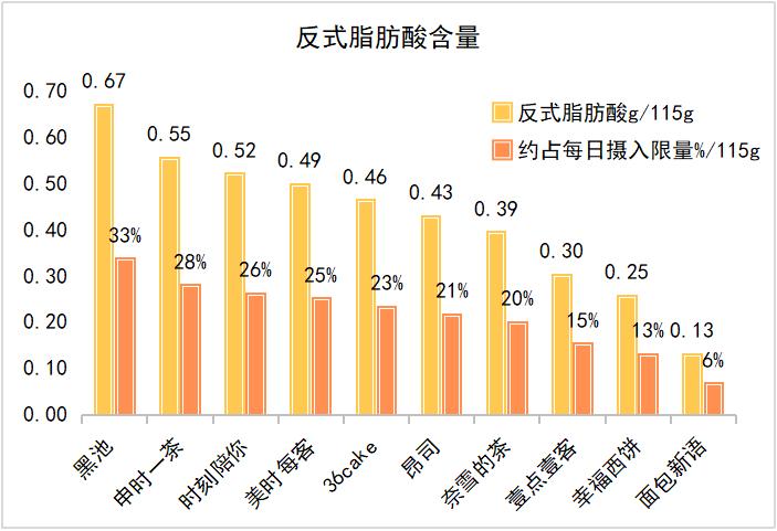 其中最高的是黑池-桃之妖妖·招郎蛋糕(0.58g/100g),如进食一份蛋糕(115g)会摄入反式脂肪酸0.67g,约占每日反式脂肪建议摄取限量(2g)的33%。