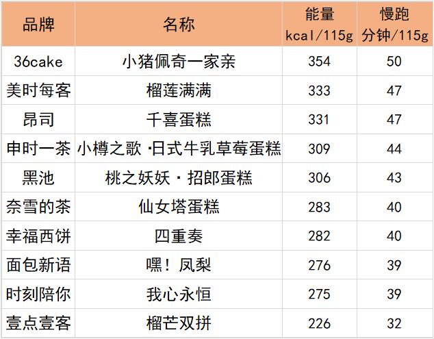 按每人每次摄入一份蛋糕(115g),慢跑每分钟消耗7.1kcal为例,列出相对应运动量消耗的能量。按这么算,10款蛋糕能量均值为297kcal/115g,吃一块蛋糕,平均需要慢跑42分钟才能消耗。