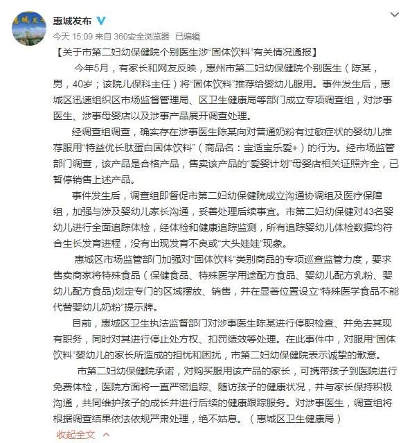 目前,惠城区卫生执法监督部门对涉事医生陈某进行停职检查、并免去其现有职务,同时对其进行停止处方权、扣罚绩效等处理。在此事件中,对服用“固体饮料”婴幼儿的家长所造成的担忧和困扰,惠州市第二妇幼保健院表示诚挚的歉意。