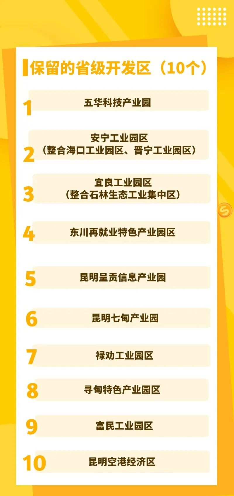 昆明市保留的省级开发区有10个:五华科技产业园、安宁工业园区、宜良工业园区、东川再就业特色产业园区、昆明呈贡信息产业园、昆明七甸产业园、禄劝工业园区、寻甸特色产业园区、富民工业园区、昆明空港经济区。