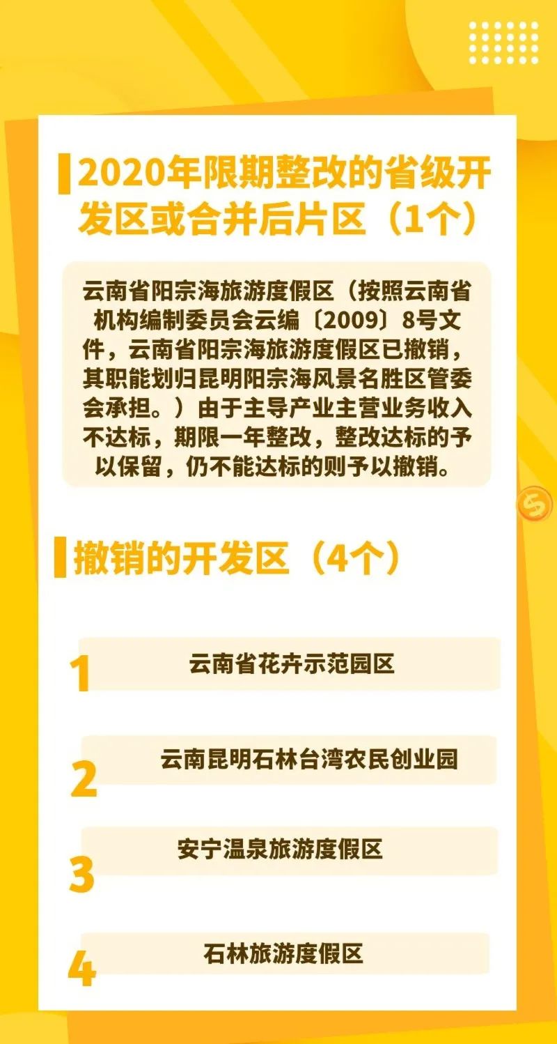 整合的省级开发区4个:云南省阳宗海旅游度假区、海口工业园区、晋宁工业园区、石林生态工业集中区。