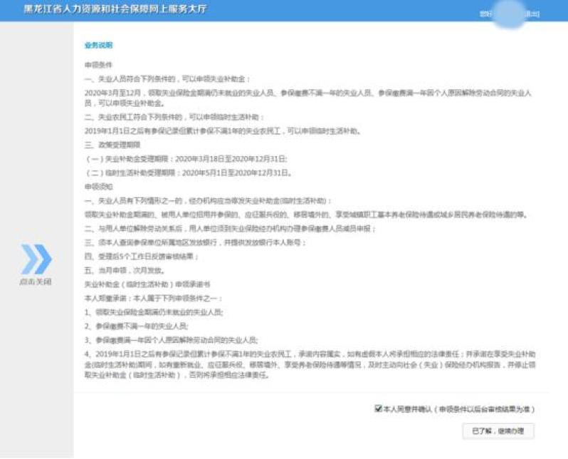 第二步:点击“我的申请”按钮,即可看到失业补助金(临时生活补助)申领按钮。如图所示: 第三步:点击“失业补助金(临时生活补助)申领”按钮,出现“业务说明”和“承诺书”等,申请人需阅读承诺书内容后,勾选“确认”,点击“已了解,继续办理”按钮,方可继续办理。如图所示: 第四步:系统显示人员信息,包括身份证号、姓名、单位名称,如实填写手机号、发放账号并选择发放银行,退回原因可在经办机构审核退回后查看。如图所示: 第五步:核对系统默认信息完毕后,填写“手机号”“发放账号”,选择“发放银行”后,点击“提交”按钮,完成网上服务大厅个人申请失业补助金(临时生活补助)业务。如图所示: 第六步:提交申请后5个工作日,原渠道登录查询审核结果。