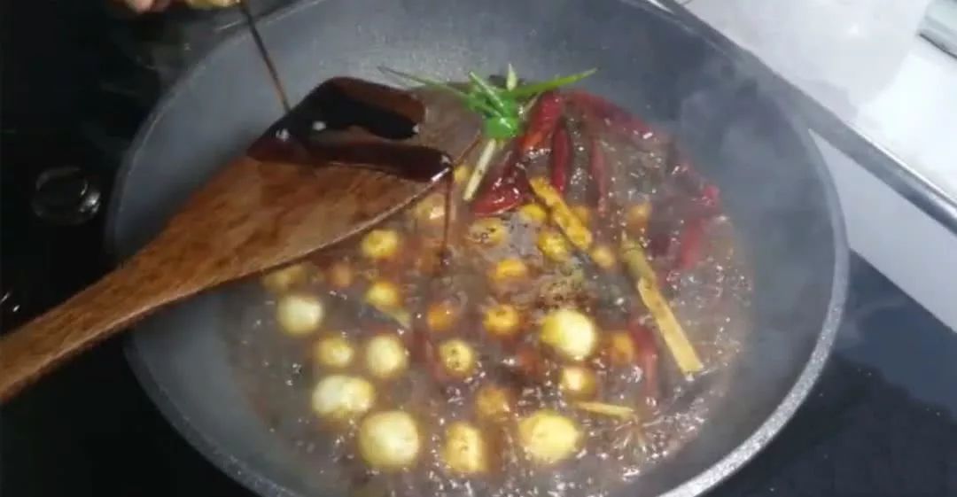 食材:鹌鹑蛋、生姜、小茴香、八角、干辣椒、花椒、香葱、桂皮、火锅底料。