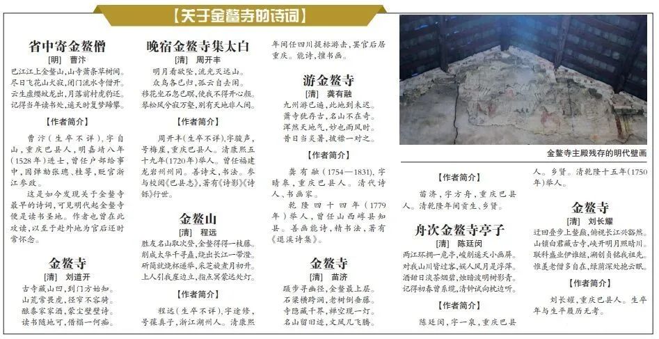 说到金鳌寺的诗文,不得不提的就是《金鳌寺碑记》。此文收录于《巴县志》中,是明末清初巴县名士刘道开所撰,以生动的笔墨记叙了金鳌寺的历史风貌。