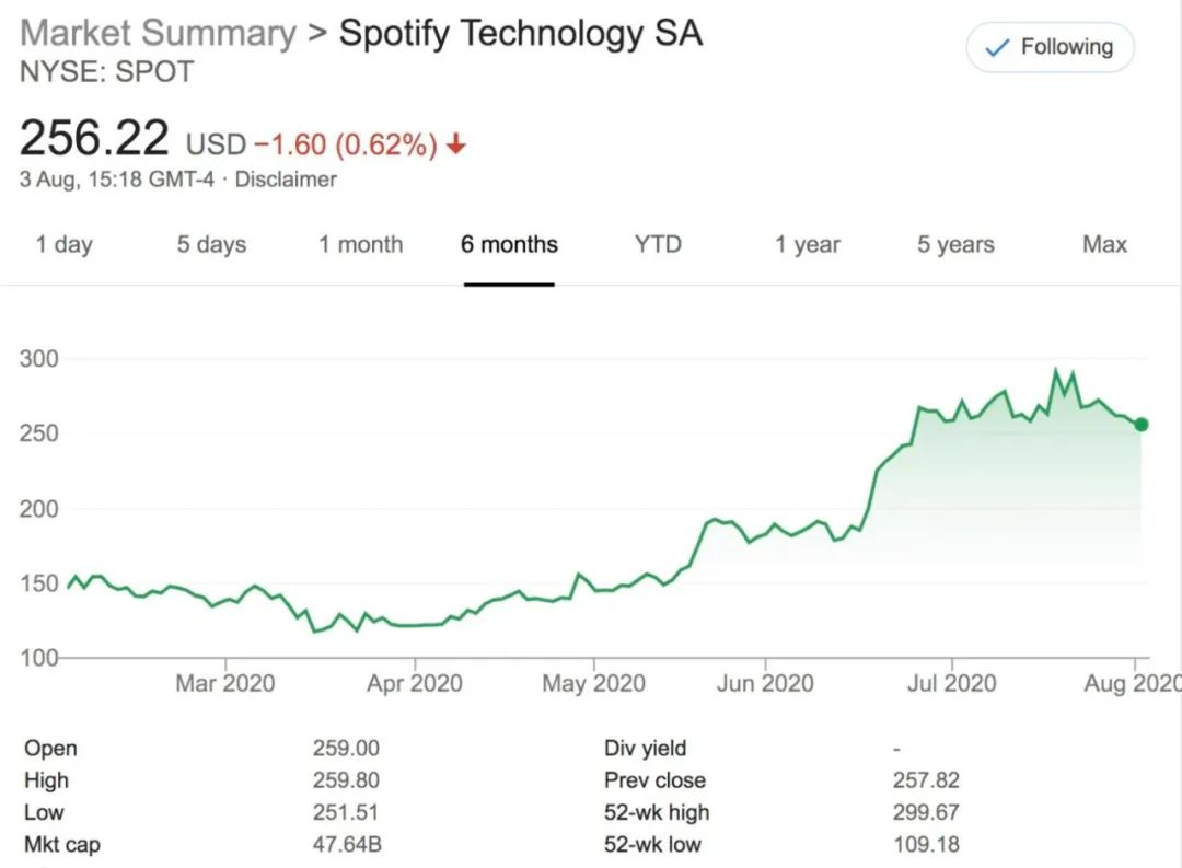 · 8月3日,在过去几个月股价大涨后,Spotify的市值持续反弹至500亿美元左右,而环球音乐拥有的Spotify 3.5%的股份市值也超过16亿美元。环球音乐母公司维旺迪的首席财务官HervéPhilippe称:"我们与Spotify建立了很好的关系,并续签了合同,对Spotify的股价在近期的上涨感到开心。我们无意出售我们在Spotify中的股份,Spotify对我们来说是非常好的合作伙伴。"