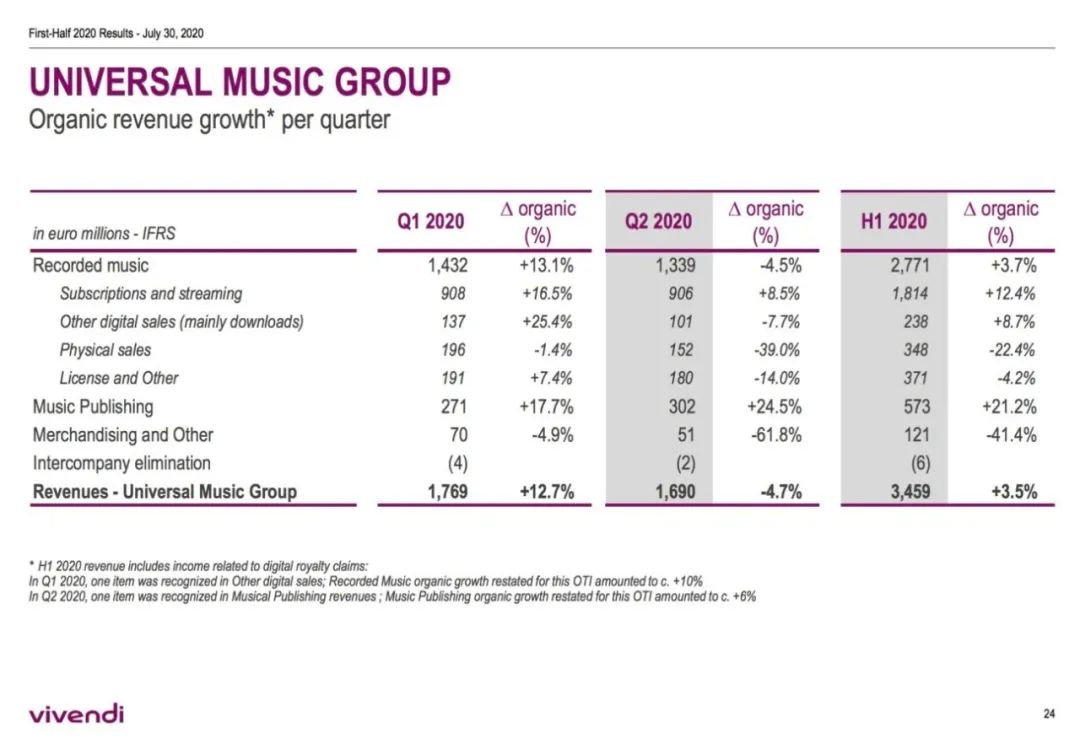 7月30日,据环球音乐母公司维旺迪发布的第二季度(及半年度)业绩显示,他们将不得不为在2020年下半年的收入增加而奋斗。