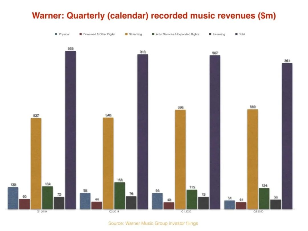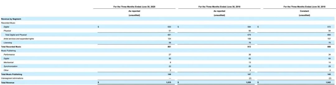 华纳音乐在2020年上半年的总营收(包括实体、数字和其他收入)为17.68亿美元,较去年同期的18.46亿美元有所下降,同比下降4.2%。