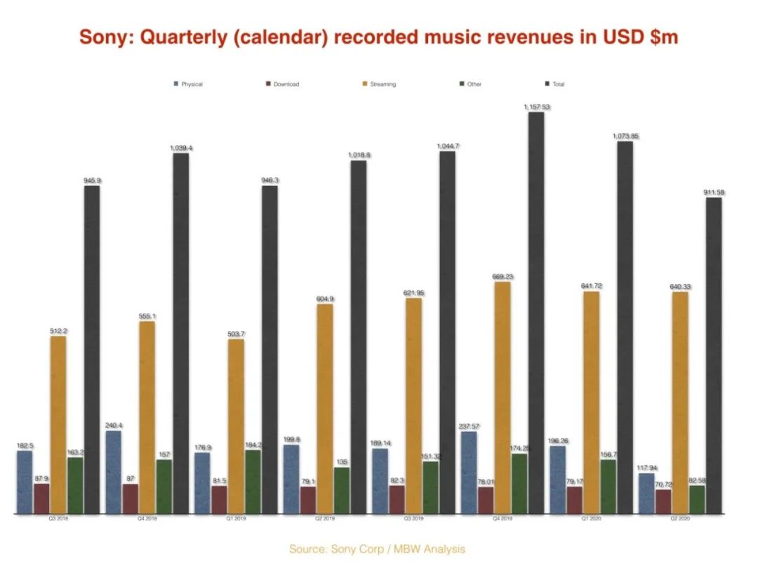 · 8月4日,索尼公司公布了2020年第二季度财报(财报年为一季度),报告显示,2020年第二季度,该公司的录制音乐总收入为9.116亿美元,同比下降10.5%。其中,流媒体收入同比增长了5.9%,达6.4亿美元;实体唱片收入同比下降41.0%,至1.18亿美元,而其他收入(包括授权收入、周边收入以及现场演出收入)下跌38.8%,至8260万美元。