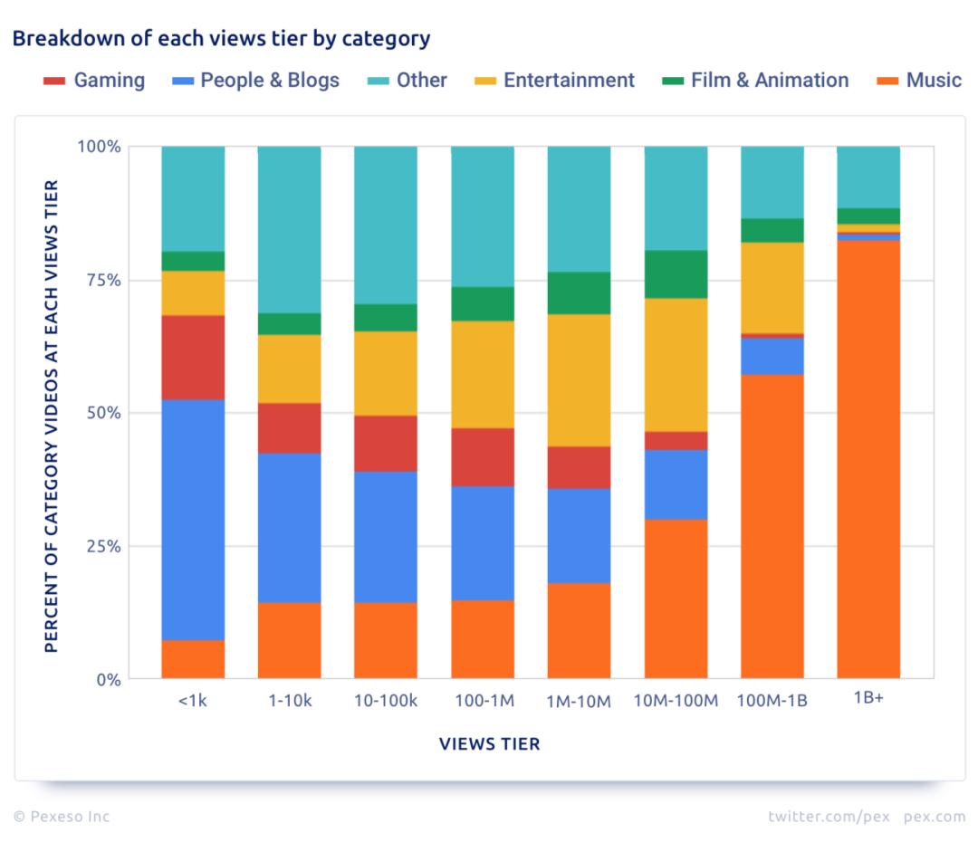 2019年,平台上观看次数超过10亿的视频中,音乐类占了83%。娱乐类视频仅占1.5%,而游戏仅占0.5%,尽管Pex称之为"游戏上传量的爆炸性增长"。根据Pex的数据,大多数新上传的视频(33%)都是游戏类。