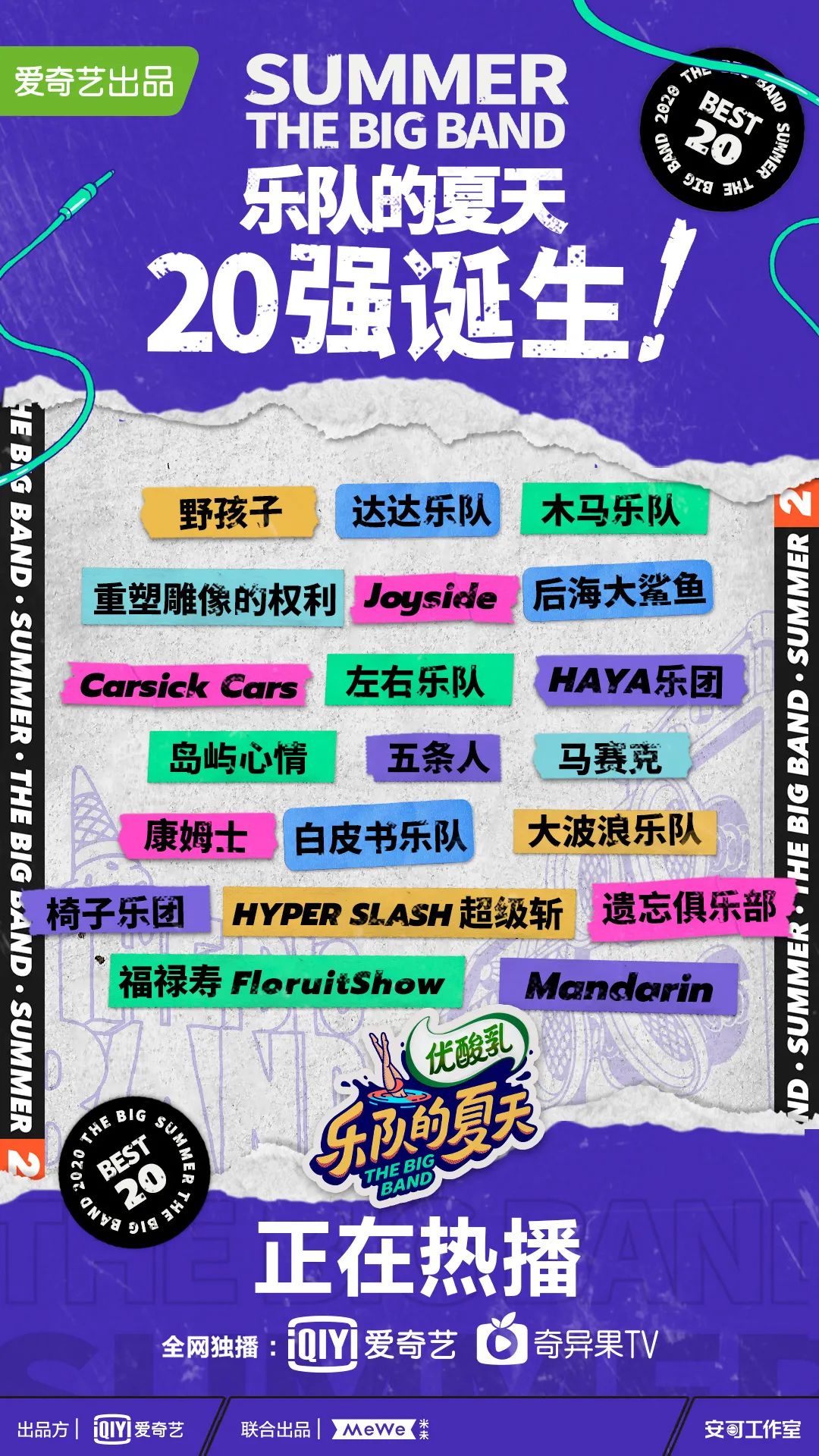 · 8月8日,爱奇艺《乐队的夏天》二十强乐队诞生,分别是野孩子、达达乐队、木马乐队、重塑雕像的权利、Joyside、后海大鲨鱼、Carsick Cars、左右乐队、HAYA乐团、岛屿心情、五条人、马赛克、康姆士、白皮书乐队、大波浪乐队、椅子乐团、HYPER SLASH超级斩、遗忘俱乐部、福禄寿FloruitShow、Mandarin。