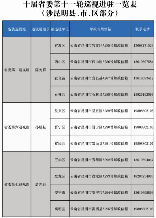 原标题:《十届省委第十一轮巡视已进驻昆明11个县(市、区)联系电话公布》