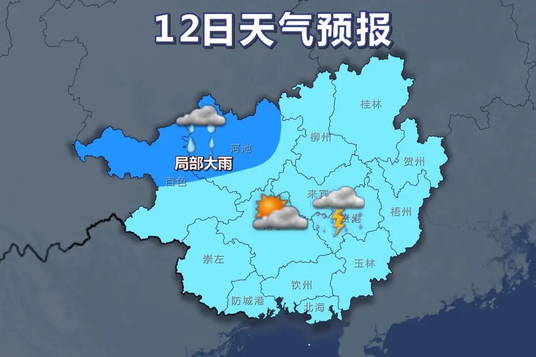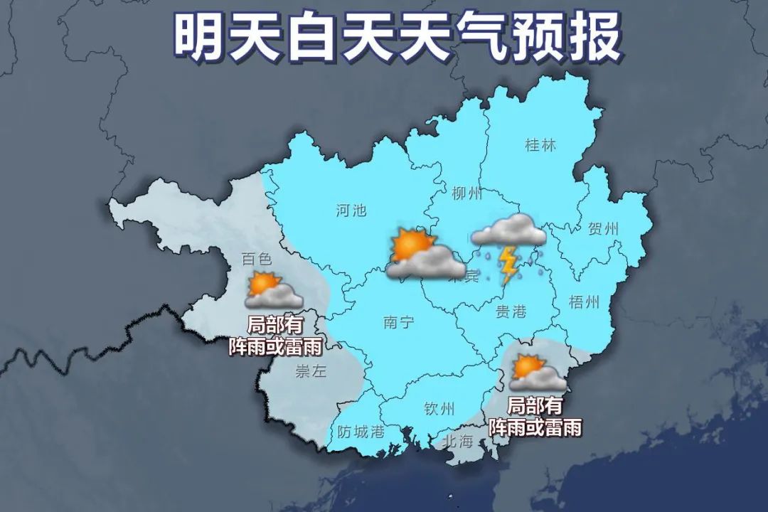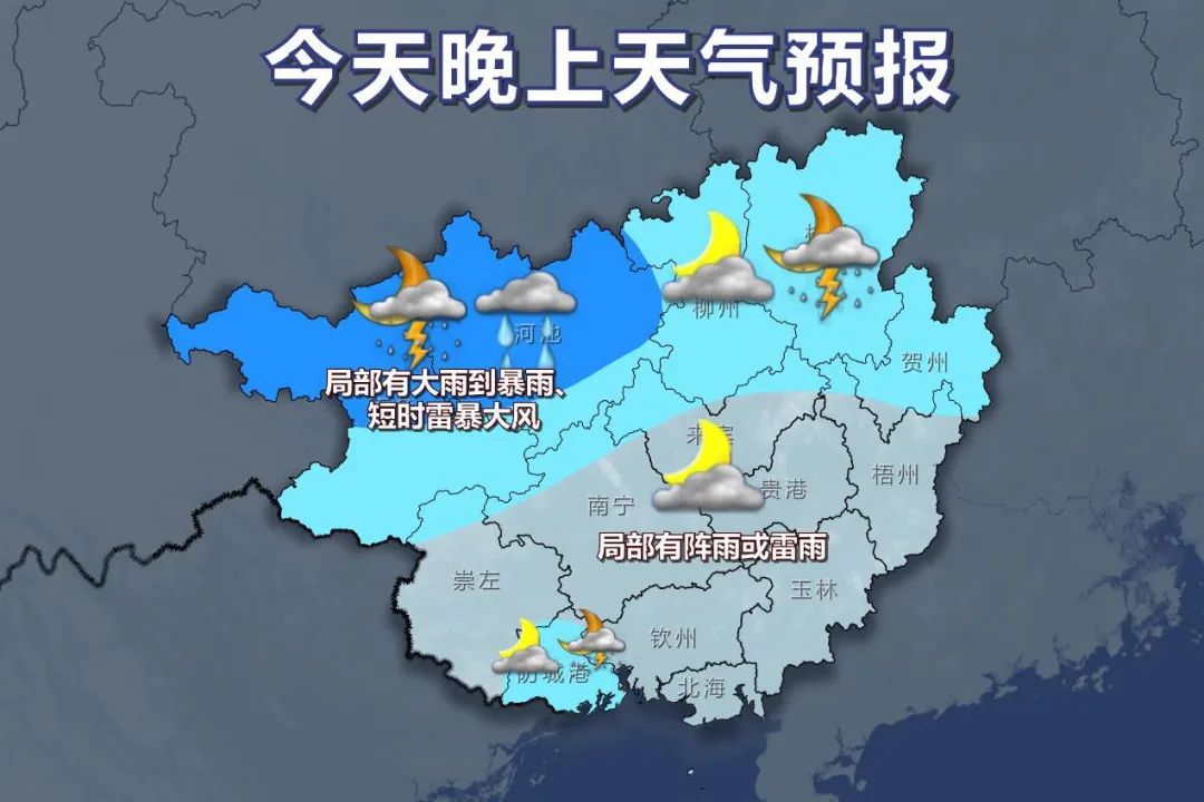 今天晚上,百色、河池、柳州、桂林、贺州、防城港等市多云到阴天有阵雨或雷雨,其中百色、河池两市的部分地区有中雨,局部有大雨到暴雨、短时雷暴大风等强对流天气,我区其它地区多云,局部有阵雨或雷雨。