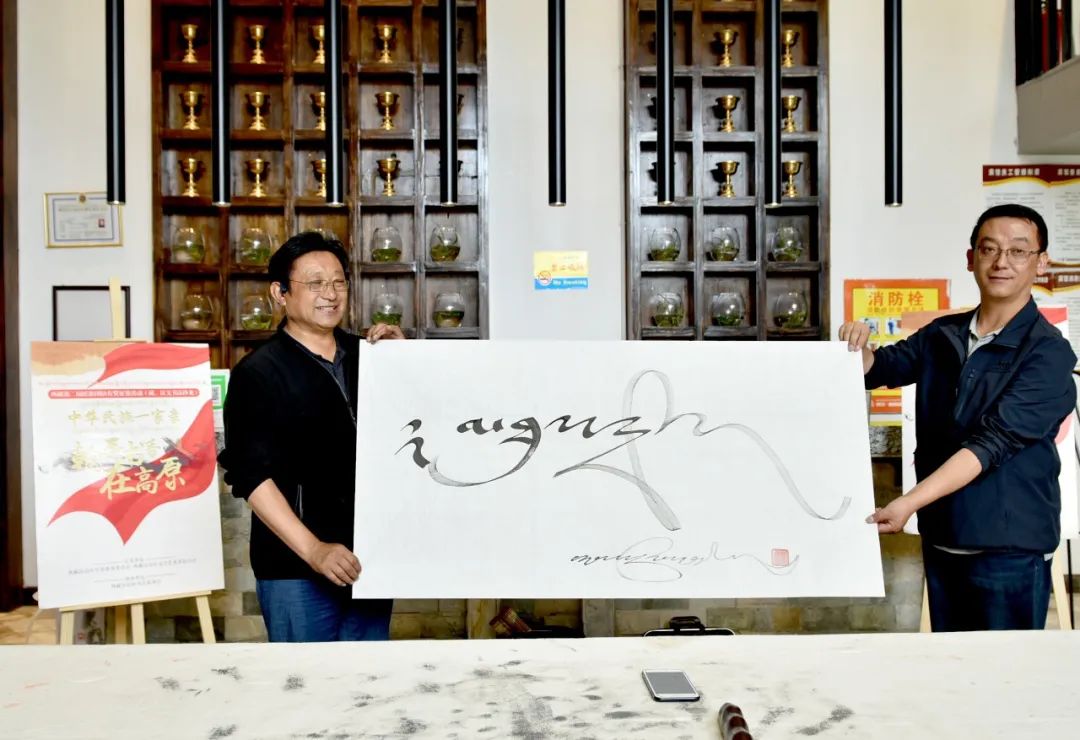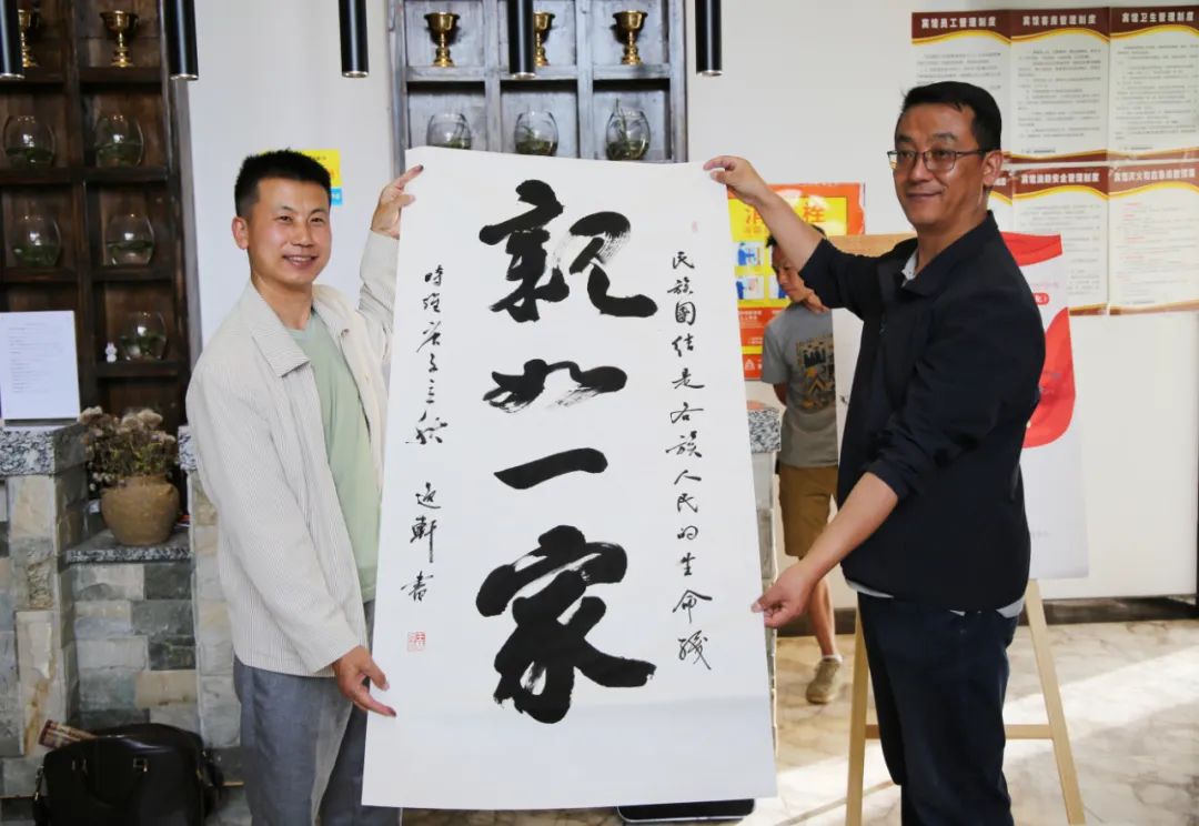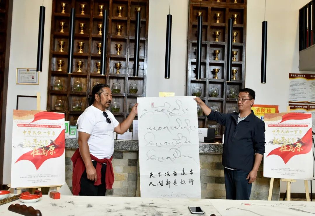 现场首幅书法作品由著名藏文书法家祖牛·拉巴次仁、田中鹤共同完成,他们用藏、汉文共同书写了一幅“天下没有远方,人间都是故乡”。祖牛·拉巴次仁表示,民族团结的意识已经深深蕴含于各族群众日常的生产生活中。田中鹤到西藏已经26年,在他的心目中,西藏就是第二故乡。“这幅字如实反映了我的心声。”田中鹤说。
