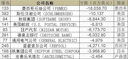 今年共有45家公司未能实现盈利。在亏损公司子榜上,墨西哥石油公司亏损约180.38亿美元,成为亏损最多公司。其中,中国共有9家公司亏损,中国化工集团公司亏损最多,亏损约12.5亿美元。
