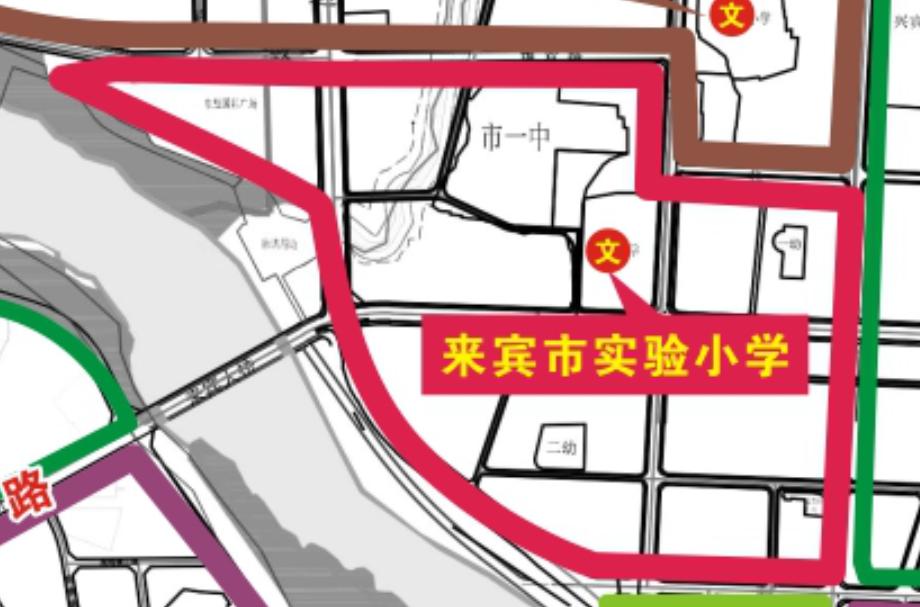 一、来宾市实验小学:沿原市公安局兴宾分局西面码头→西南一路→东南一路→东南一路与中南路交叉路口→中南路→中南路与北四路交叉路口→北四路→北四路与柳来路交叉路口→柳来路→柳来路与维欢路交叉路口→维欢路→滨江北路东→红水河北岸这一路线范围内的区域。