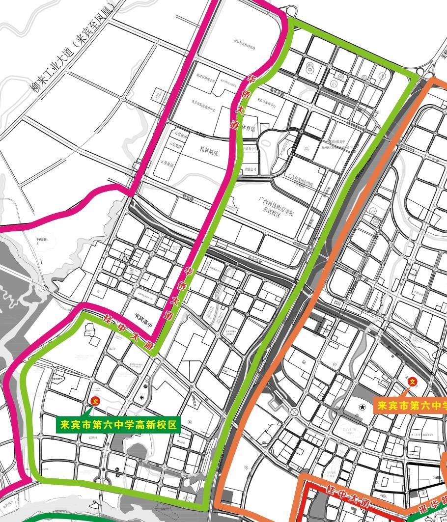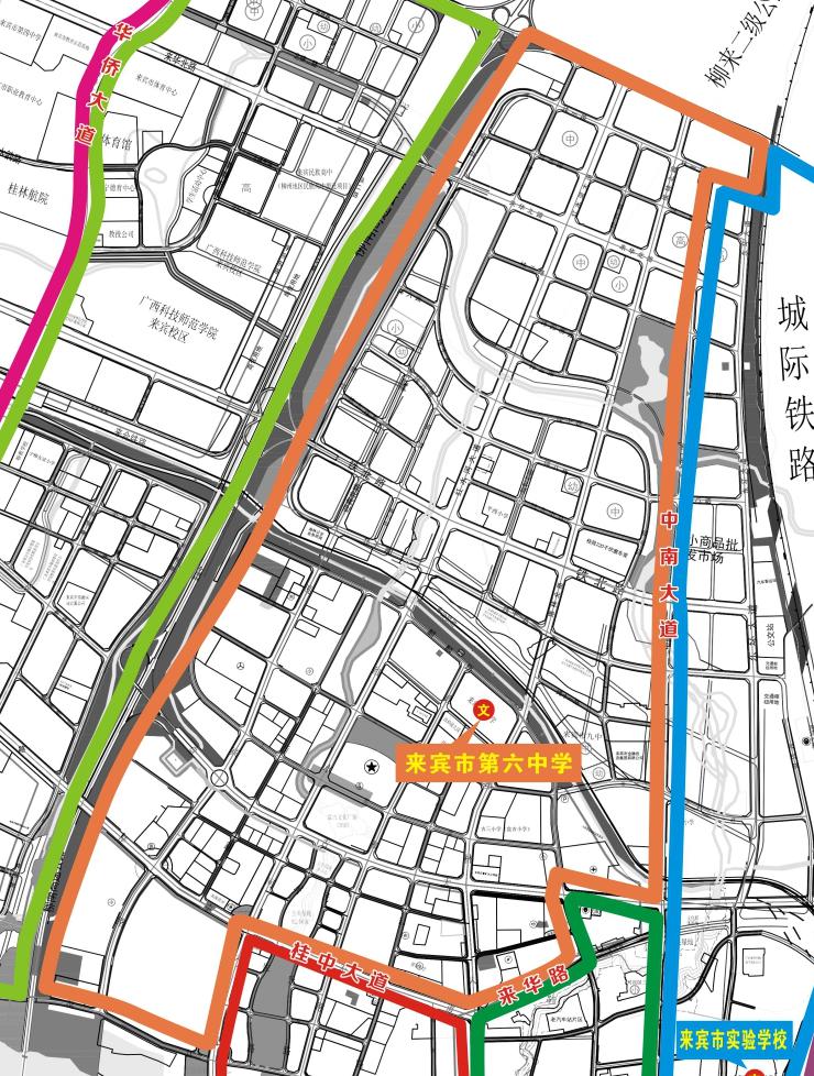 一、来宾市第六中学:沿(城北)中南大道→中南大道与盘古大道交叉路口→盘古大道→盘古大道与柳来路交叉路口→柳来路→柳来路与来华路交叉路口→来华路→桂中大道→桂中大道与红水河大道交叉路口→红水河大道→来宾二桥头北这一路线以西,原泉南高速公路以东范围内的城区区域。