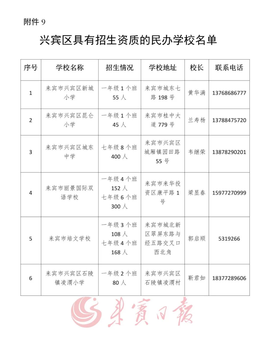 9. 兴宾区具有招生资质的民办学校名单