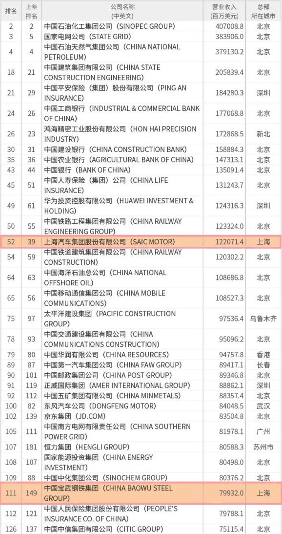 受去年以来车市整体低迷影响,上海企业中排名最高的上汽集团此次排名全球第52位,较去年有所下降。但今年榜单中,上汽集团仍是国内第一、全球第七大车企,连续7年进入世界500强前百强。