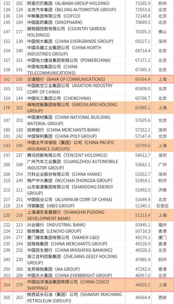 2020年度《财富》世界500强排行榜发布,其中133家来自中国,9家总部在上海,浦东有6家,分别是:上海汽车集团股份有限公司、中国宝武钢铁集团、交通银行、中国远洋海运集团有限公司、上海建工集团股份有限公司、上海医药集团股份有限公司。