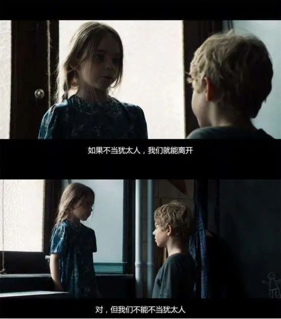 金发小男孩在面对纳粹的枪口和恐吓时,孤注一掷、勇敢反抗,并且告诉年幼的小妹妹,“犹太人的出身无法选择和改变的”,在这个过程中他完成了自我身份的认同。