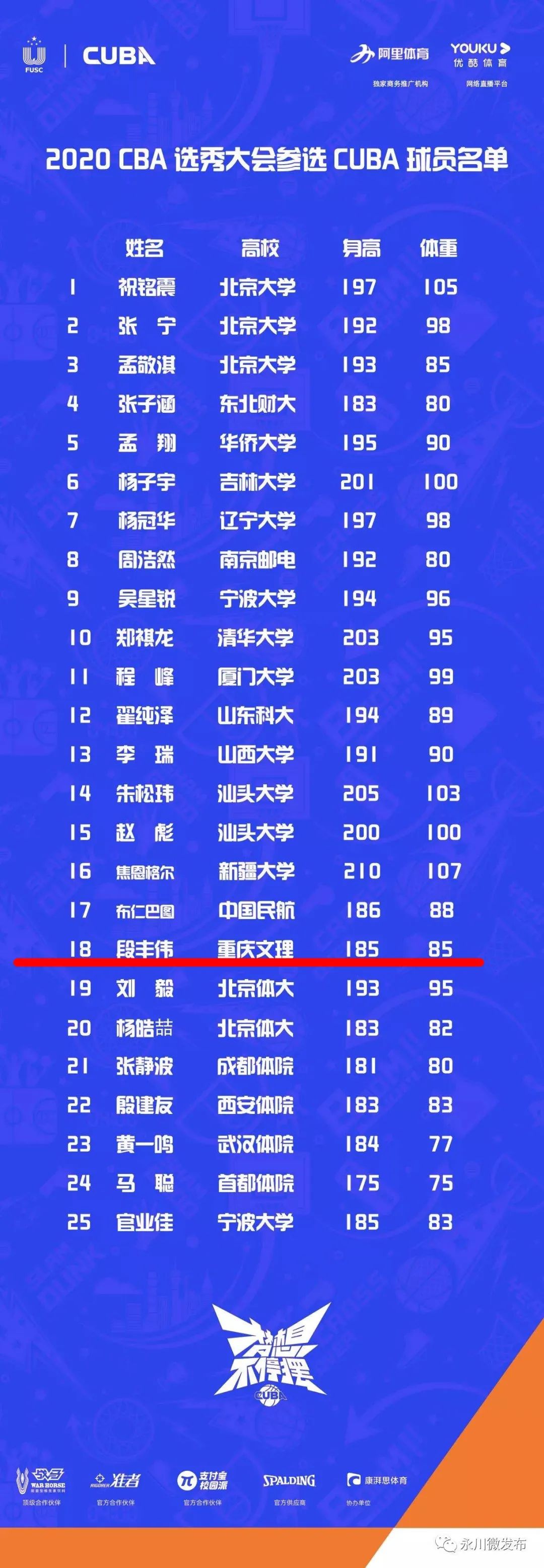 原标题:《CBA选秀名单正式公布,永川学子首次上榜!》