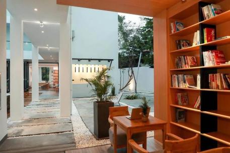 海口市区驱车20分钟左右可到达的民宿,有得天独厚的地理位置,地处海南著名风景区火山地质公园。主体建筑延续了民宿素与简的风格灰瓦白墙,运用留白的建筑写意,白色与原木色系为主色调清爽干净,明晰硬朗的线条,外墙是由不规则的天然火山岩石堆砌而成,既有文化的地域性又兼具现代美学,在舒适和美学基础上保留着淳朴的乡野民风。