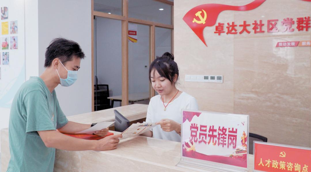 卓达大社区综合服务中心则筑起一个个城市基层党建“综合体”,为所覆盖的三个社区一个村委会居民提供即办、陪办、代办、咨询等服务,涉及社会事务、劳动就业、社会保险、社会救助、社会福利、计划生育等方面。