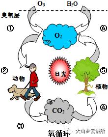 绿色植物出现以前,地球的大气中几乎没有氧。那时,氧只是以氧化的低能量状态存在于各种氧化物中,无论是空气中还是水中或是岩石圈内都没有游离氧的存在。在距今20亿至30亿年以前,绿色植物在地球上出现并逐渐占有优势以后,通过光合作用,使无机碳转化为有机碳、太阳能转变为化学能、并且释放氧气,地球的大气中才逐渐含有氧,从而使地球上其他进行有氧呼吸的生物得以生存和发展。又由于大气中的一部分氧转化成臭氧,在大气之上形成臭氧层有效地滤去太阳辐射中对生物具有强烈破坏作用的紫外线,从而使水生生物开始逐渐能够在陆地上生活。经过长期的生物进化过程,最后出现广泛分布在自然界的各种生物。