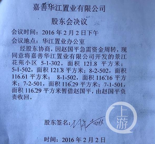 上游新闻记者获取的2015年及2016年的三份股东会决议显示,赵国平因急需资金周转,曾要求暂借华江公司房产融资偿还个人债务,股东均签字表示同意,并明确由赵国平负责收回。