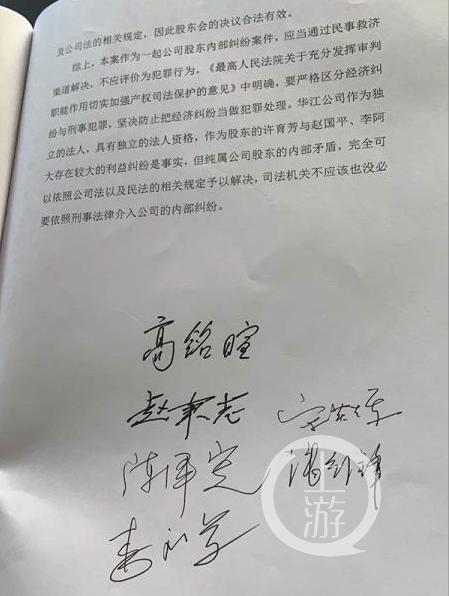 另外,包括中国法学会刑法学研究会名誉会长高铭暄,北京师范大学法学院教授、中国法学会刑法学研究会会长赵秉志,中国社会科学院法学所教授、中国刑法学研究会常务副会长陈泽宪等在内的6名法学专家,在阅卷后认为华江置业作为独立的法人,具有独立的法人资格,作为股东的许育芳与赵国平、李阿大存在较大的利益纠纷是事实,但纯属公司股东的内部矛盾,完全可以依照公司法以及民法的相关规定予以解决,司法机关没必要依照刑法介入公司的内部纠纷。
