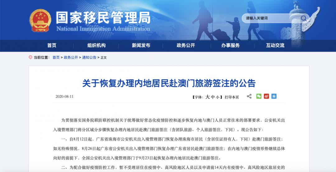 ▶8月26日起恢复办理广东省居民赴澳门旅游签注 据国家移民管理局,公安机关出入境管理部门将分区域分步骤恢复办理内地居民赴澳门旅游签注。8月26日起恢复办理广东省居民赴澳门旅游签注;9月23日起恢复办理内地居民赴澳门旅游签注。