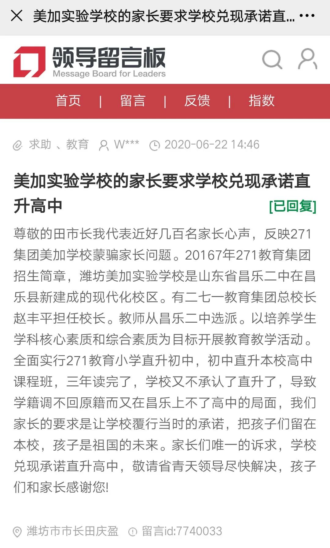 2019年山东271教育集团利用上级政策,统筹集团资源,解决了潍坊美加实验学校部分学生升入普通高中学习的问题,让今年部分初三家长产生继续直升高中的想法。2020年5月29日,山东省教育厅下发了《关于做好2020年普通高中招生入学工作的通知》(鲁教基字﹝2020﹞7号),民办高中跨市域的招生政策发生重大变化,提出民办高中需要跨市招生的,学校应分市提出生源计划,纳入当地高中招生并参加统一招生考试、统一录取、统一管理。山东271教育集团无法采取2019年的办法满足家长诉求。
