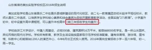 根据这一通知要求,学校的“直升高中”应在2016年宣告结束。事实上,即便在2017年的招生季,潍坊美加实验学校在招生过程中依然在宣扬“直升高中”这一“卖点”。经调查,小编发现网上仍然可以查询到山东省潍坊美加实验学校2016年和2017年的招生说明,其中明确写到了“小学直升初中,初中设直升高中课程班,可以直升本校高中(前三年招收学生均直升)”。
