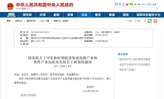 8月4日,国务院发布关于印发《新时期促进集成电路产业和软件产业高质量发展的若干政策》的通知。