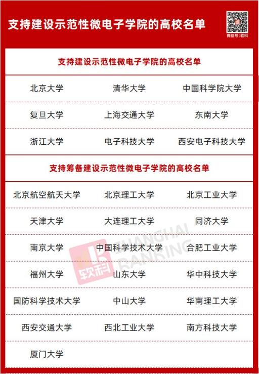 9所支持建设示范性微电子学院的高校包括北京大学、清华大学、中国科学院大学、复旦大学、上海交通大学、东南大学、浙江大学、电子科技大学和西安电子科技大学。