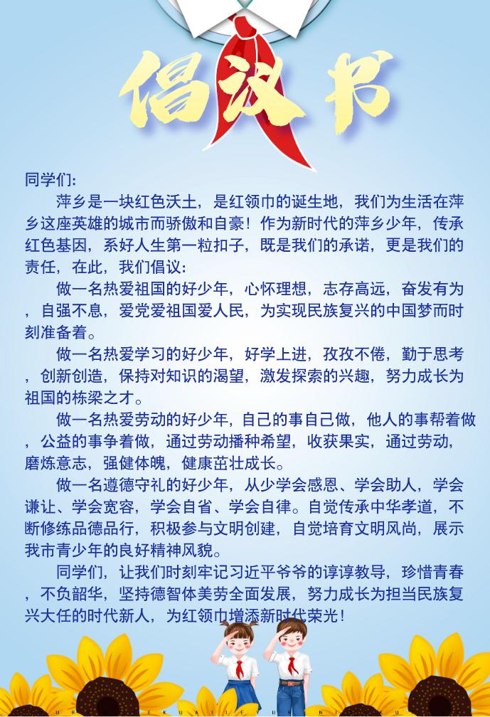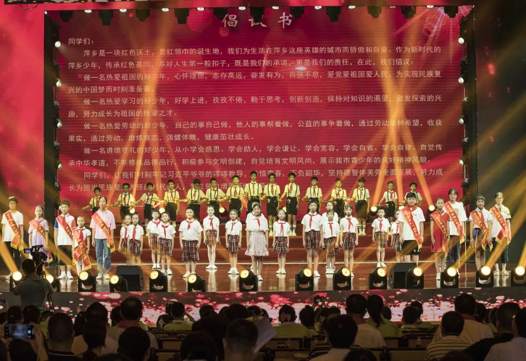 发布仪式结束之际,10位新时代好少年登台倡议:“作为新时代的萍乡少年,传承红色基因,系好人生第一粒扣子,既是我们的承诺,更是我们的责任,让我们时刻牢记习近平爷爷的谆谆教导,珍惜青春,不负韶华,坚持德智体美劳全面发展,努力成长为担当民族复兴大任的时代新人,为红领巾增添新时代荣光!”