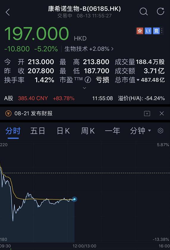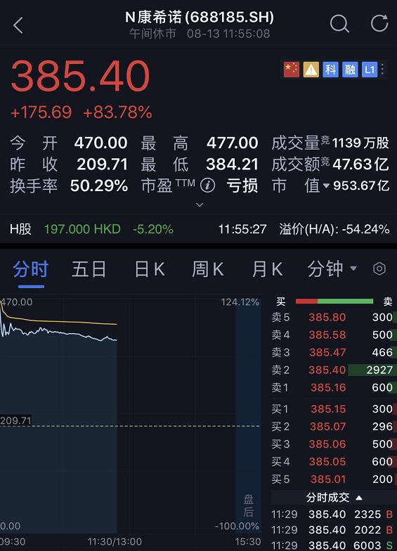 8月13日,康希诺正式登陆科创板,且成为首只“A+H”的疫苗。首日,康希诺开盘上涨124.12%,报470元/股,中一签约赚13万。不过随后股价稍有回落,截至收盘,涨幅收窄至83%,市值950亿。