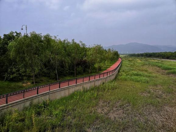 行至风峪河,站在跨河桥上向西望,太山山峦起伏,似乎触手可及,独特的风光令人流连。尤其特别的是,两岸河堤铺设彩色沥青道路,一路蜿蜒,市民可以踏上河堤,沉浸式感受风峪河风光,这种设计,“九河”唯一。