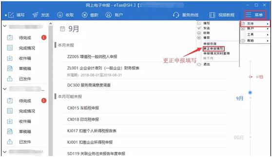 如下图,在eTaX@SH 3申报软件中点击“菜单——文件——更正申报填写”。