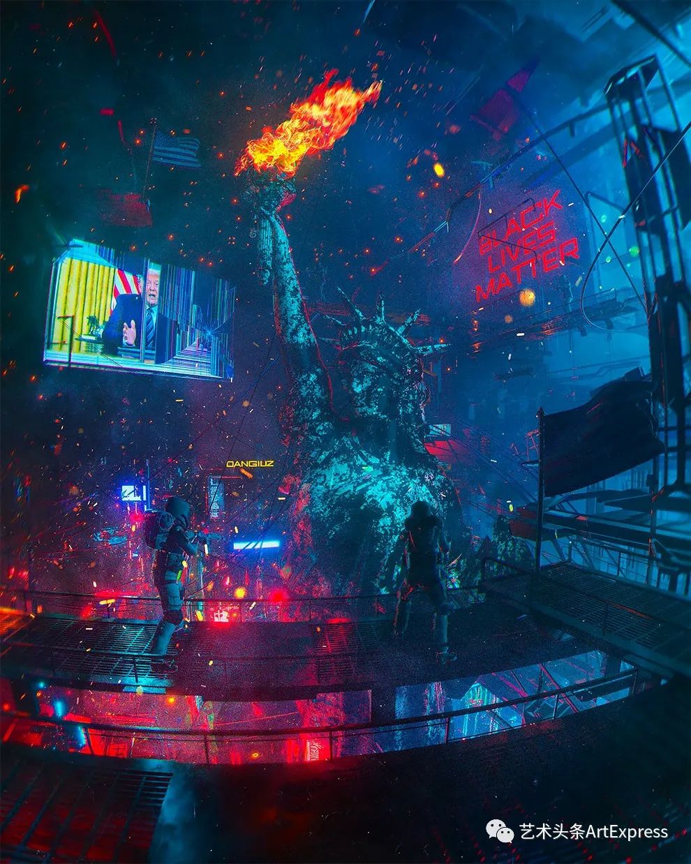 “其实,所有的赛博朋克作品都在讲一件事,就是旨在服务人类的高科技,发展到某个阶段后,会反过来影响人类、束缚人类、压迫人类。”Dangiuz解释他为什么钟爱赛博朋克。