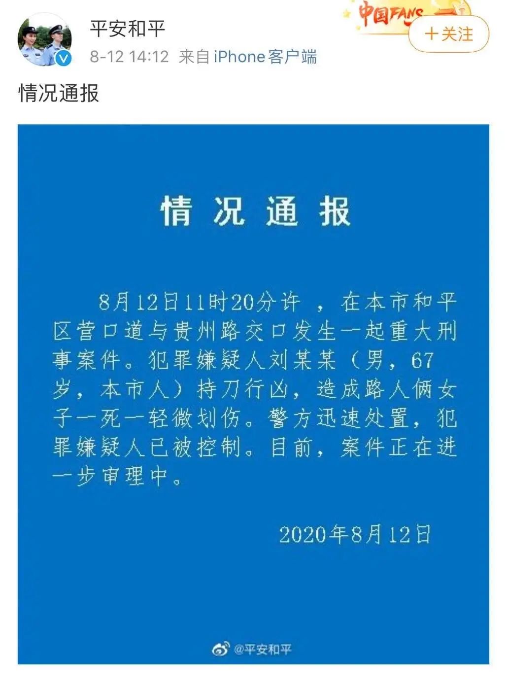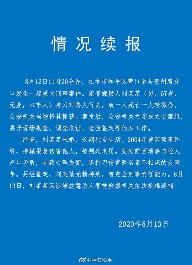 8月13日下午3点,@平安和平 发布续报,8月12日11时20分许,在天津市和平区营口道与贵州路交口发生一起重大刑事案件。犯罪嫌疑人刘某某(男,67岁,天津市人)持刀对路人行凶,致一人死亡一人轻微伤。