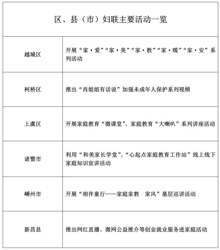 开展千村万户传家风活动。联合市文明办开展最美乡村的家风建设、最美家庭的家规家训征集宣传活动,深入挖掘各地家风建设中的特色亮点,把好家风、好风尚拍摄成视频短片,拟在“抖in绍兴”滚动播放。开展厉行节约、公筷公勺宣传。贯彻习总书记重要指示,通过“越地女儿”走访宣传、嵊州越剧“小九妹”等多种宣传形式,将公筷公勺、反对餐桌浪费等倡导宣传到家庭。开展“绿色家庭”选树。广泛开展寻找省级、市级绿色家庭活动,推荐省级绿色家庭8户、寻找认定市级绿色家庭50户。