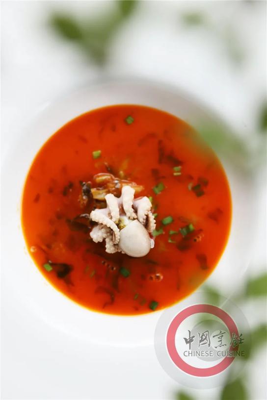 老坛酸菜的汤汁与望潮的鲜味对比强烈,酸爽之余更有鲜香回味。