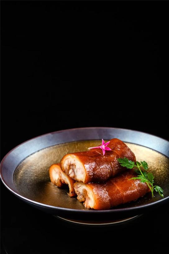 将猪手提前2天治净,以流水冲漂6小时;锅内加水、姜、葱、白酒,入猪手焯水,洗净后一劈二,入潮州卤水中以小火卤2小时〜3小时至软糯,取出拆骨,码盘做点缀即可。