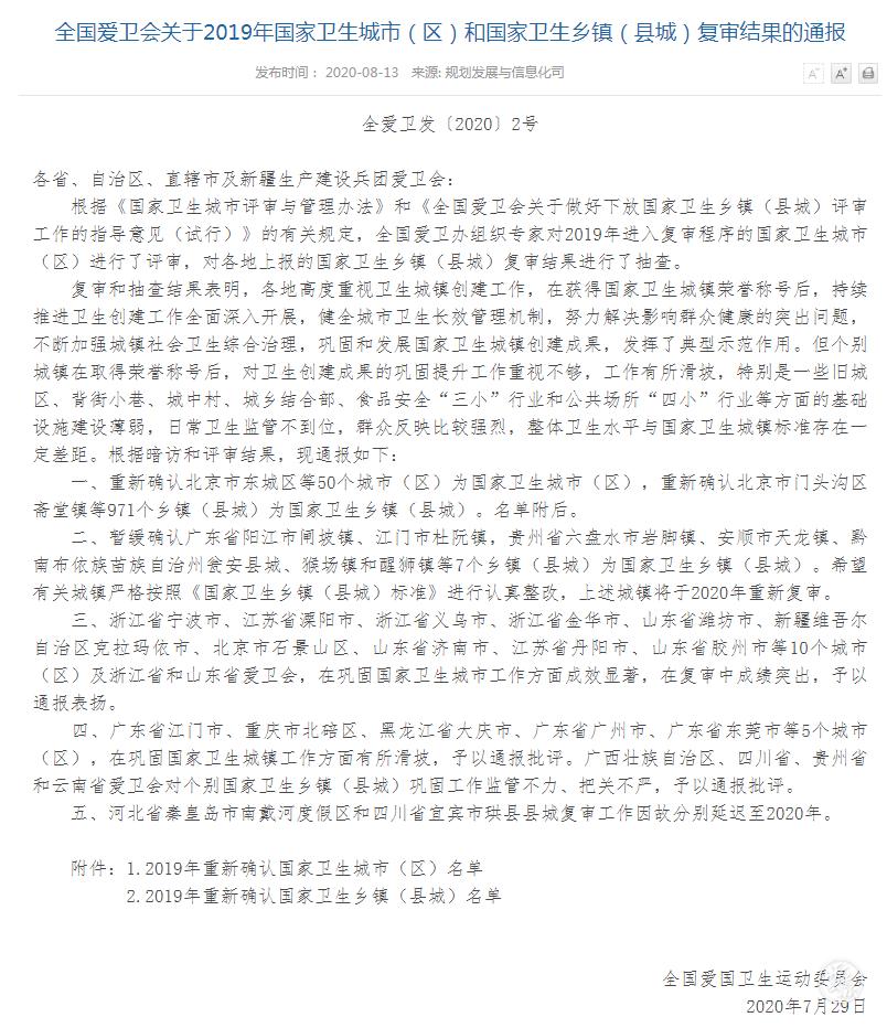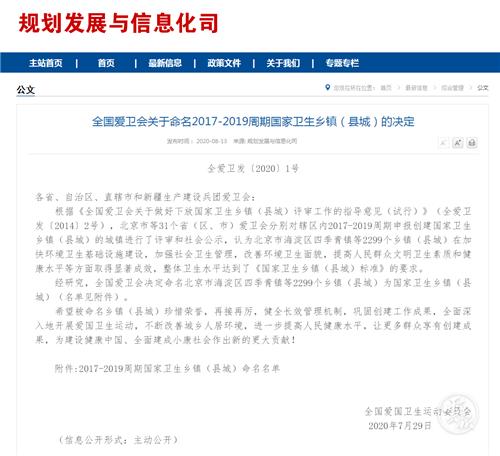 8月13日,全国爱国卫生运动委员会发布《全国爱卫会关于命名2017-2019周期国家卫生乡镇(县城)的决定》,公布了2017-2019周期国家卫生乡镇(县城)命名名单,昆明3地入选。