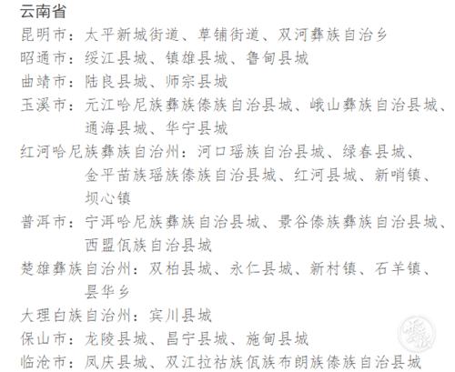 昆明市:宜良县城、富民县城、禄脿街道、云龙乡、禄劝彝族苗族自治县城、寻甸回族彝族自治县城、六街镇、二街镇