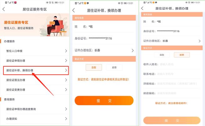 已在吉林省办理过居住证,因遗失、损坏等原因需要补领、换领,填写基本信息后可以选择“自取”或“邮寄”的方式取证,邮寄需要填写收件人相关信息,到付邮寄费用。