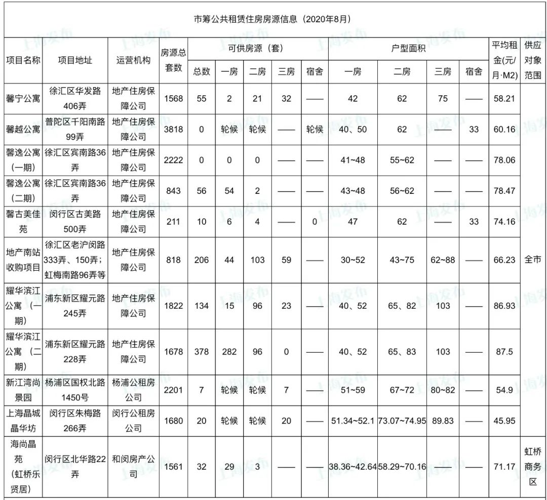 市房管局发布2020年8月市筹公共租赁住房房源信息,包括徐汇区馨宁公寓、馨逸公寓,普陀区馨越公寓,浦东新区耀华滨江公寓等。可供房源总数898套,户型一房至三房,面积30-103平米,平均租金45.95-87.5元/月/平米。
