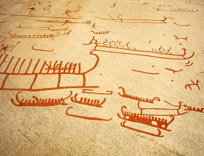 在瑞典西南部海岸的塔努姆,发现了多处上古遗迹,这里共有约二百幅岩雕画,由上古人类在岩石上雕刻或锻打出来,然后再涂上红色。我们可以在这些画里看到大量船只,其中有些船上还能清晰地辨认出桨手划船的动作。这些船驶向何方?它们正在前往冥府吗?