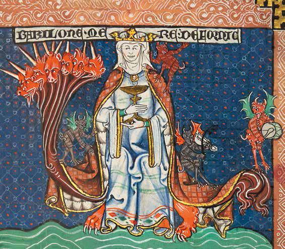 根据《启示录》,巴比伦大淫妇“穿着紫色和朱红色的衣服”,“地上的君王与她行淫,住在地上的人喝醉了她淫乱的酒”。在这幅画里,她穿了一件华丽的菱格斗篷,内衬为灰白条纹。她骑乘的七头怪兽通体为鲜红色,因为《启示录》说:“那女人喝醉了圣徒的血。”